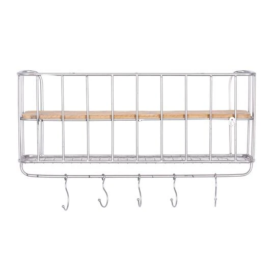 These industrial themed wall shelves with hooks work great on kitchen walls above the sink, or any room that needs more organization space and style. The top tier shelf is made of wood in a natural brown finish while the bottom tier shelf features metal grills on the bottom of the basket. The 5 metal hooks are attached to a horizontal metal attachment where they can freely move since they are connected via a movable ring.