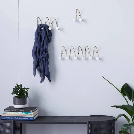 Modern interiors carry a harmony of chaos in its midst that a proper home organization is a must. Pieces like this 3-in-1 set of wall-mounted hooks for towels, aprons, robes, and clothes help with this goal. It’s made of iron and ceramic and carries 6, 4, and 2 sets of hooks. Use it against plain-colored and -textured walls to best appreciate its design. This item comes shipped in one carton. One of the three items has six hooks, the other has four, and the last has two. Easy to hang with small back ring hooks. Suitable for indoor use only. Each hook holds 5 to 8 lbs. This is a three-piece set of wall hooks. Glam inspired.