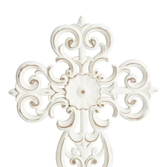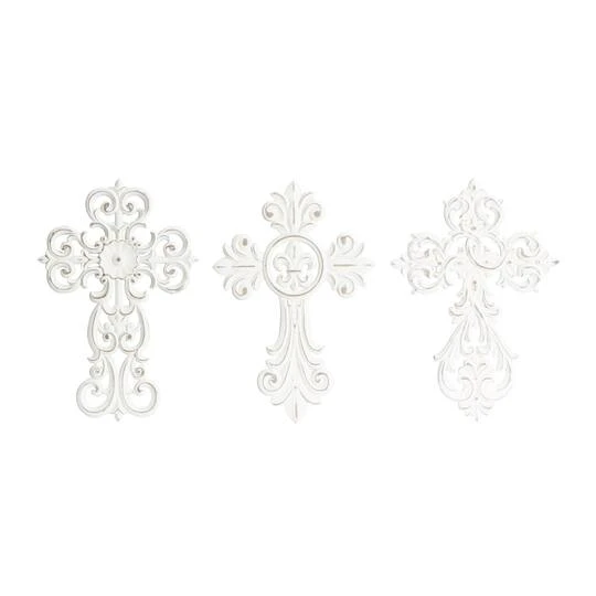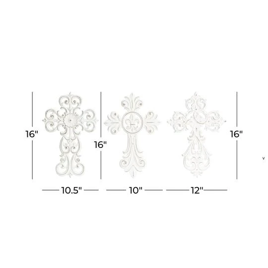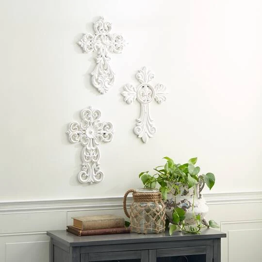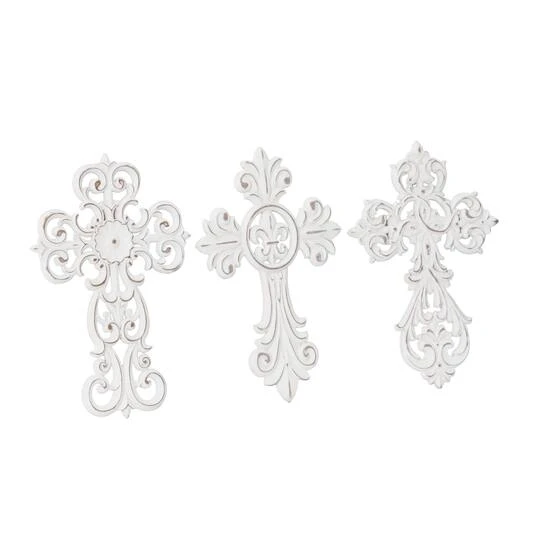 Create an excellent focal point on your walls paired with some cute accent tables, and level up your home with this amazing wood wall decor. A great centerpiece over your sofa, mantel, dining table, or bed, it brings a piece of your personality to your home. Hang a cross above a doorframe to add a spiritual touch to your space. This item ships in one carton. Easily hanging using hanging hardware on the back. Suitable for indoor use only. The wooden crosses come in a set of 3, each with a different design. Traditional theme.