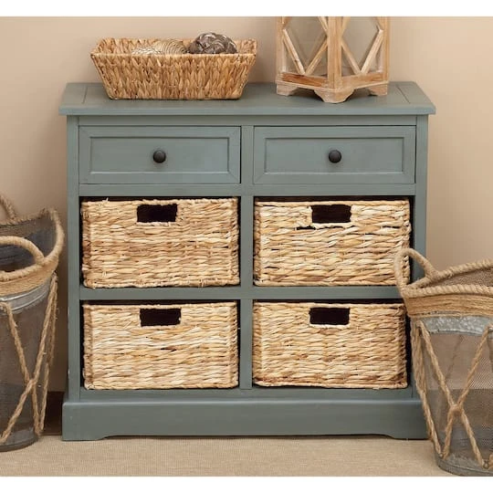- Features 2 drawers and 4 woven baskets