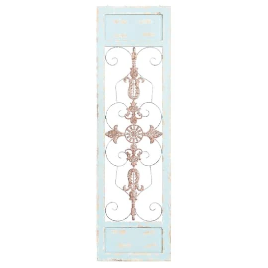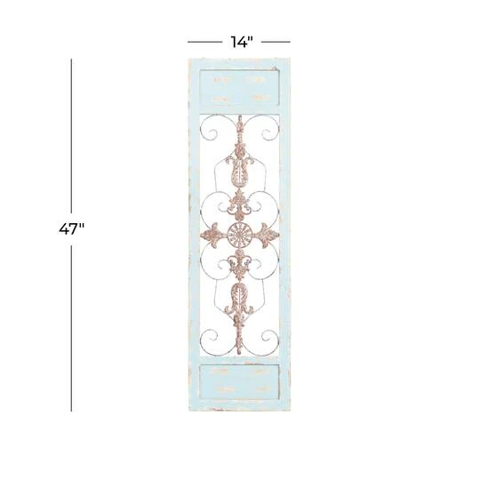 Accessorize your living space with this wood and metal wall panel. This eye-catching home décor features a wooden frame in turquoise finish, cut-out center with rusted iron scrollwork, and fleur-de-lis center medallion. This wall decoration suits traditional and farmhouse themed spaces that crave for stylish home design.