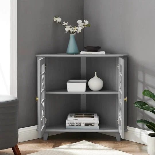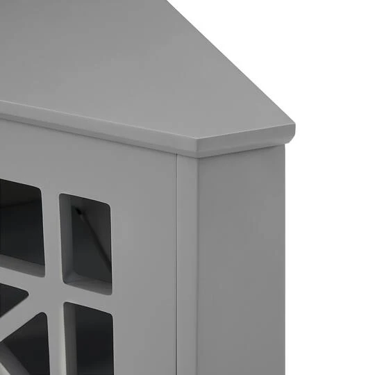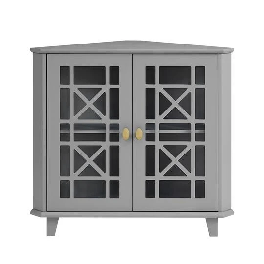 The unique fretwork of this gorgeous piece will be the crowning glory in your home, and can easily spice up your space as a corner accent table or stylish bar cabinet. This transitional piece boasts delicate painted steel handles that complement the table’s understated minimalism, while the intricate cutouts on the front lend a subtle nod to contemporary global design. Furnish the corner accent table with a decorative array of tasteful décor, or use it to store your family’s favorite board games, storybooks, or DVD collection that you can hide behind the two soft-close doors.