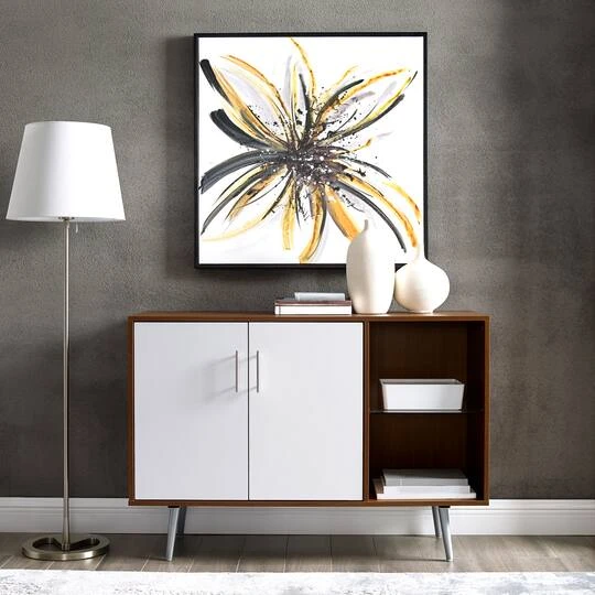 Take this adaptable console into just about any room in your home for added storage space. From your living room as a TV stand that can fit up to a 48-inch TV with cord management in the back or sideboard for your household essentials, in your kitchen as a buffet for your dishes and your kitchen necessities, or in your bedroom as a storage console keeping your room organized. The combination of materials from metal accents, glass, laminate, and the color contrasts make this piece exude a mid-century modern and transitional style. Both outside and hidden shelving make it easy for you keep tidy in your home. It features adjustable shelves and rubber feet with magnetic doors to best fit your needs.
