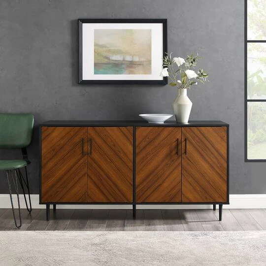 The perfect functional display piece, this bookmatch-styled buffet is the piece you didn’t know you needed. Comprised of mixed materials of metal hardware and durable laminate doors for a two-toned finish with adjustable rubber feet, the possibilities are endless. Whether placed in your unique kitchen as a traditional buffet or your living room for additional storage, this piece will feel both new and familiar with its mid-century modern appeal.