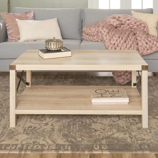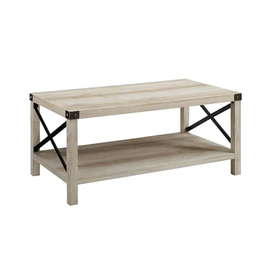 Give your living room some rustic style with our industrial inspired coffee table. Black painted metal accents are featured on the top corners and x-shaped sides, which contrast beautifully with the wood textured surface made from durable laminate. Coffee table provides just enough space for placing down items from your TV remote to your mail, while also having a shelf underneath for simple storage or décor