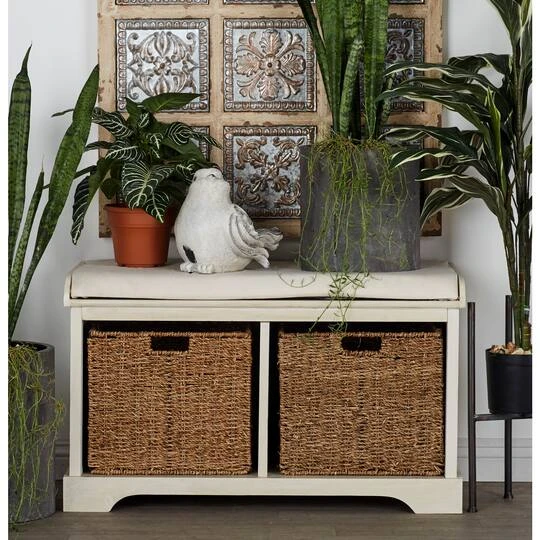 This bench with shoe storage serves as a multi-functional and elegant seat and organizer for the mudroom, entryway, or hallway. Organizing isn’t boring when you have an amazing storage unit at your disposal. Filled with shoes, books, blankets and more, these storage units are a stylish and convenient way to store your stuff. Designed with rubber stoppers at the base that prevent scratching furniture and table tops, as well as sliding around. This item comes shipped in one carton. This door bench with shoe storage has a fabric cushion. Wipe clean with a dry cloth. Suitable for indoor use only. Some assembly required. Traditional theme. Maximum weight limit is 250 lbs