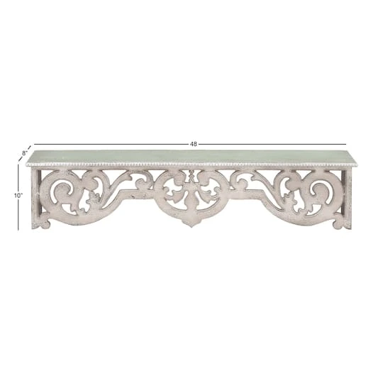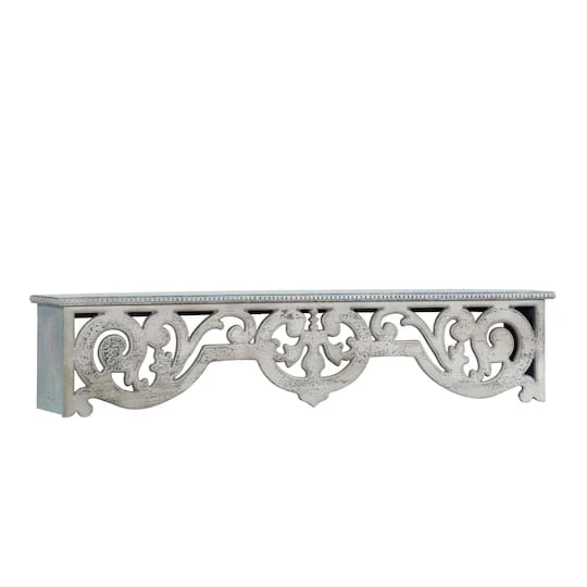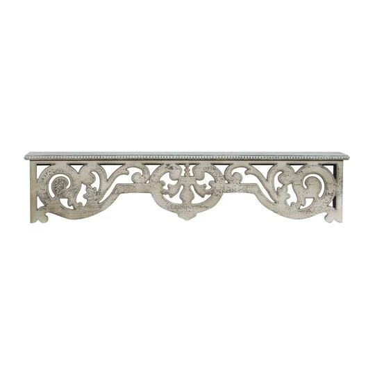 You can never go wrong with the classics when picking out a wooden wall shelf for your country and farmhouse inspired home. This vintage style rectangular wooden wall shelf will definitely satisfy your craving for an elegant yet functional piece of decor in your home. This wall shelf features beautiful wooden carvings on the front side draping the shelf ledge. The distressed white finish on this piece sets it apart from the rest since it complements the vintage theme of the decor. This wall shelf can easily be mounted in place using the easy mount slots fastened at the back of the shelf. Place this on any wall of your farmhouse inspired living space and instantly recognize how the classics never go out of style. This item comes shipped in one carton. Easy to hang with 2 back keyhole hooks. Suitable for indoor use only. Holds up to 20 lbs. Farmhouse-themed style.