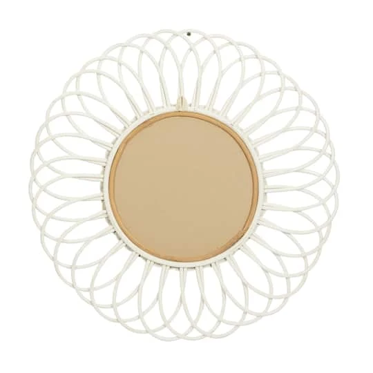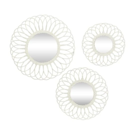 Reminisce about your favorite tropical beach resort with this coastal and traditional style white woven rattan wall mirrors set. The handwoven rattan detail on these mirrors will definitely remind you of the white sand beaches due to its clean and crisp delicate white finish. The intricate weaving pattern leading up to the flower petal outer design makes these mirrors a must-have for every coastal inspired living space. Every time you look in these mirrors, you will see yourself basking in the sun and hear crashing waves.