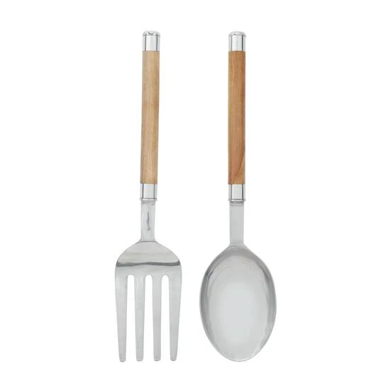 Hang a fun and classic piece of décor into your traditional, industrial, and farmhouse-inspired living home styles by adding this large set of aluminum and wood utensils! This set showcases two large sculptures of a spoon and a fork made of solid aluminum and oak brown colored dowels made of pure mango wood.